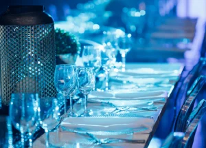 Elegant dining table set up in blue lighting featuring wine glasses and white napkins on plates with a decorative lantern and plant centerpiece Sophisticated ambiance
