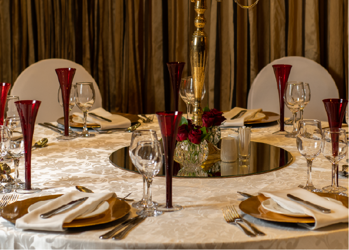 Elegant table setting with a round white tablecloth adorned with red glasses gold plates folded napkins and a centerpiece of red roses exuding a formal romantic ambiance
