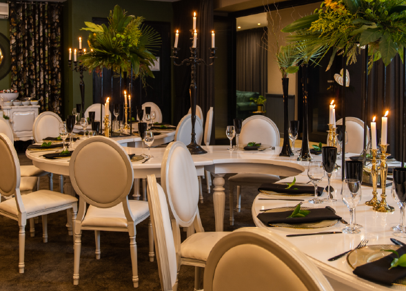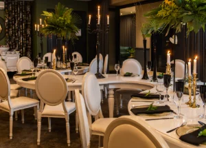 Elegant dining room with white round tables cushioned chairs and candlelit decor Tall green foliage centerpieces add sophistication and warmth