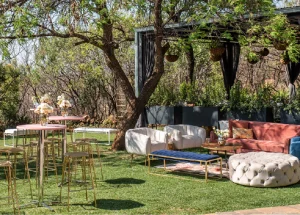 Outdoor garden setting with elegant furniture under a tree Gold tables white chairs pink sofa and plush ottoman create a cozy inviting atmosphere