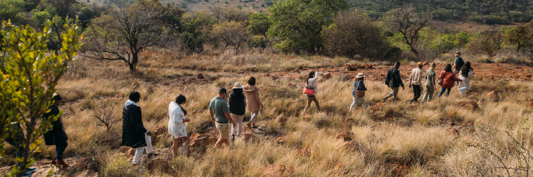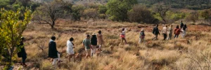 A group of people hike through grassy terrain with scattered trees under a clear sky They follow a narrow path evoking a sense of adventure and exploration