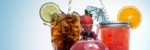 An assortment of colorful beverages iced tea with lime and straw berry smoothie and orange drink in a jar each garnished with fresh fruits