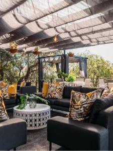 Outdoor patio with dark sofas adorned with yellow and floral cushions round table and hanging plants Relaxed ambiance under a shaded canopy amidst trees