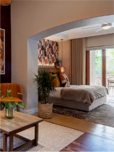 A cozy bedroom with warm earth tones featuring a plush bed abstract artwork and potted plants A sliding door opens to a bright patio