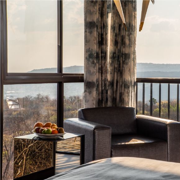 Enjoy beautiful garden views from the floor-to-ceiling windows or step out onto your private balcony and take in the African bush. Our King Rooms are designed to meet your every need.