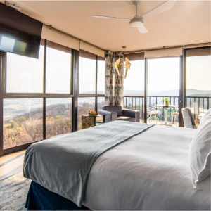 A luxurious bedroom with a large bed soft gray bedding and expansive windows showcasing a scenic mountain view A balcony cozy seating and warm sunlight enhance the tranquil ambiance