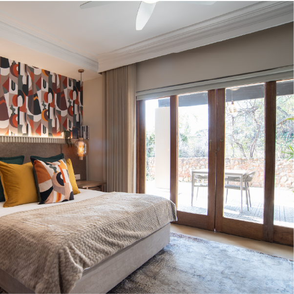 Modern bedroom with a cozy beige bed colorful abstract headboard and yellow cushions Sunlit patio visible through large sliding glass doors